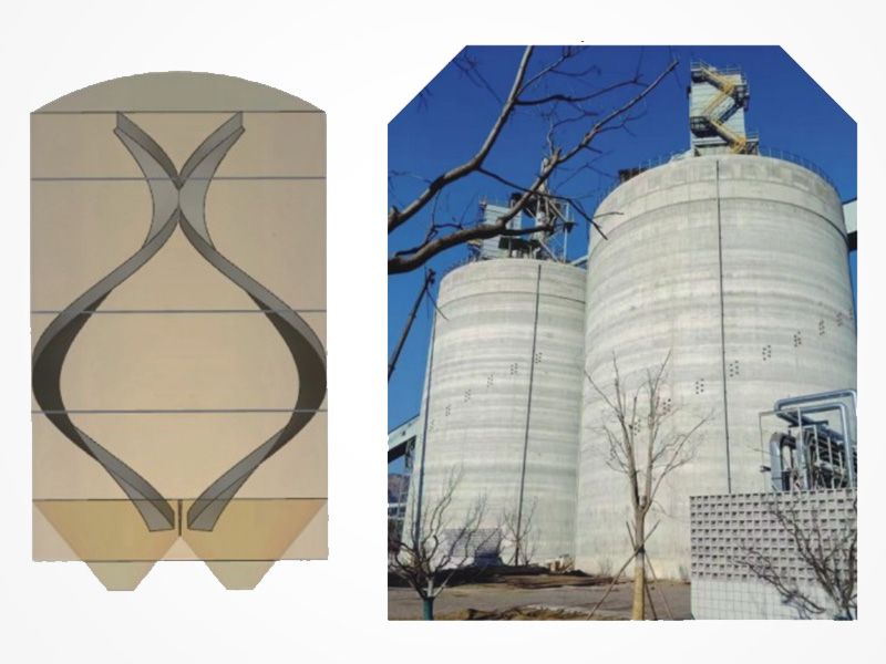 利用倉(cāng)壁安裝螺旋下滑裝置,使物料沿倉(cāng)壁溜槽下滑至倉(cāng)底,減少物料垂直加速正面撞擊產(chǎn)生破碎,降低物料限下率,且在使用過(guò)程中不影響倉(cāng)容。